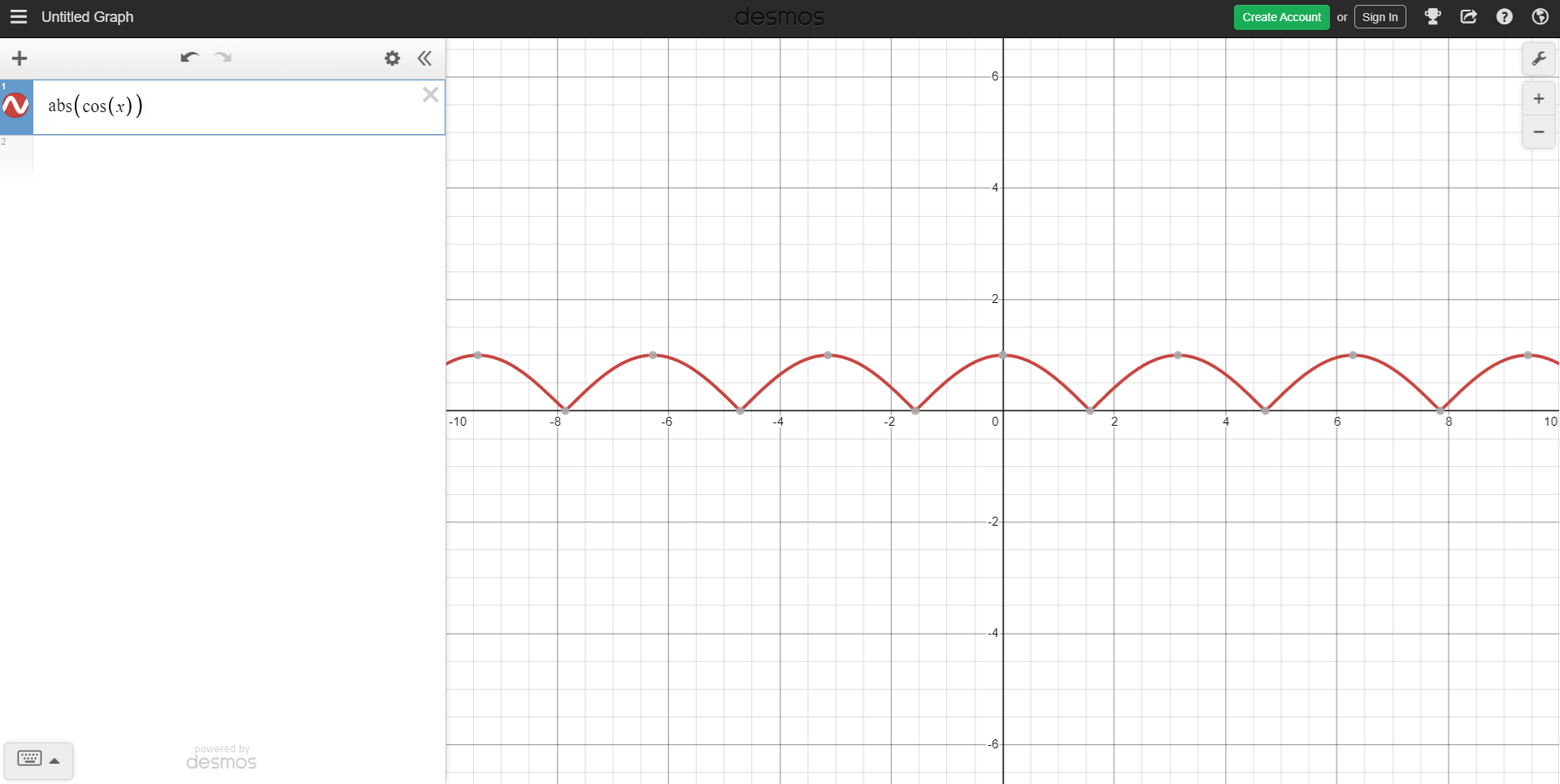 To get a better visual of the actual equation, here is the base equation abs(cos()). Those paying attention may notice that it doesn't exactly look like a wave. And you'd be correct! However, I found that using the